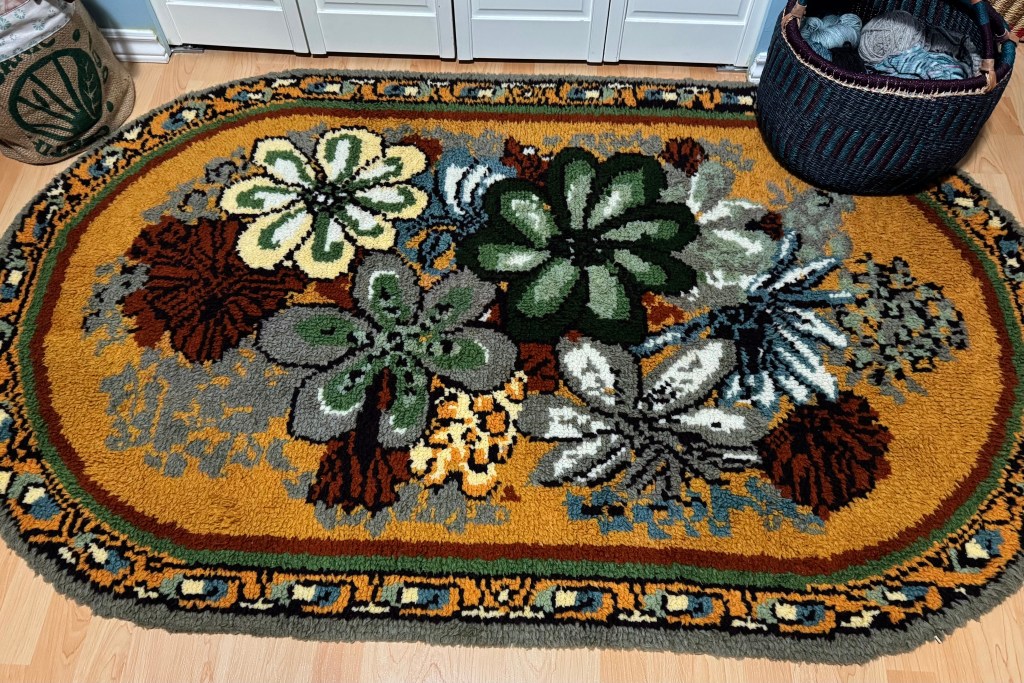 My husband offered to take it to the dry cleaning-slash-alterations business he frequents to get his work gear repaired. The miracle worker who owns the business told him she couldn’t guarantee that a thorough cleaning wouldn’t damage it further, so he called me to see what I wanted to do. I decided it was better to try to save it instead of leaving it rolled up and forgotten as I’ve done for over twenty years. The woman agreed, telling my husband the rug is a timeless work of art that should be appreciated and used. I thought the same thing when I unrolled it the other day. It’s charmingly retro. Special. Made by hardworking hands that refused to stay idle during a painful and depressing time.